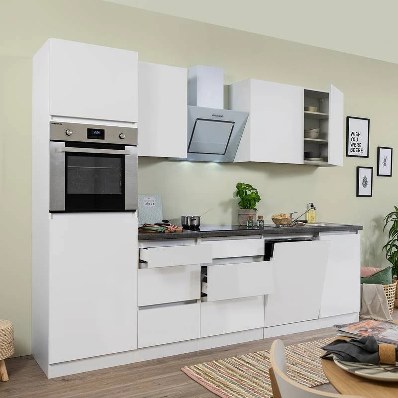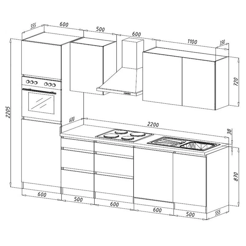 - Cuisine équipée comprenant 1 meuble pour réfrigérateur et four encastrables de 60 cm, 1 meuble bas de 50 cm, 1 meuble bas pour plaque de cuisson de 60 cm, 1 meuble sous évier de 50 cm, 1 évier encastrable en acier inoxydable avec évacuation et trop plein, 1 caisson pour lave-vaisselle de 60 cm, 1 meuble haut de 50 cm, 1 meuble haut de 110 cm et 1 plan de travail